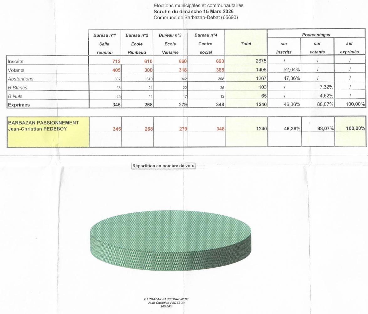 Lors des élections municipales du 15 mars 2026, les Barbazanais ont renouvelé leur soutien à la liste BARBAZAN PASSIONNEMENT menée par Jean Christian Pebeboy, maire sortant.